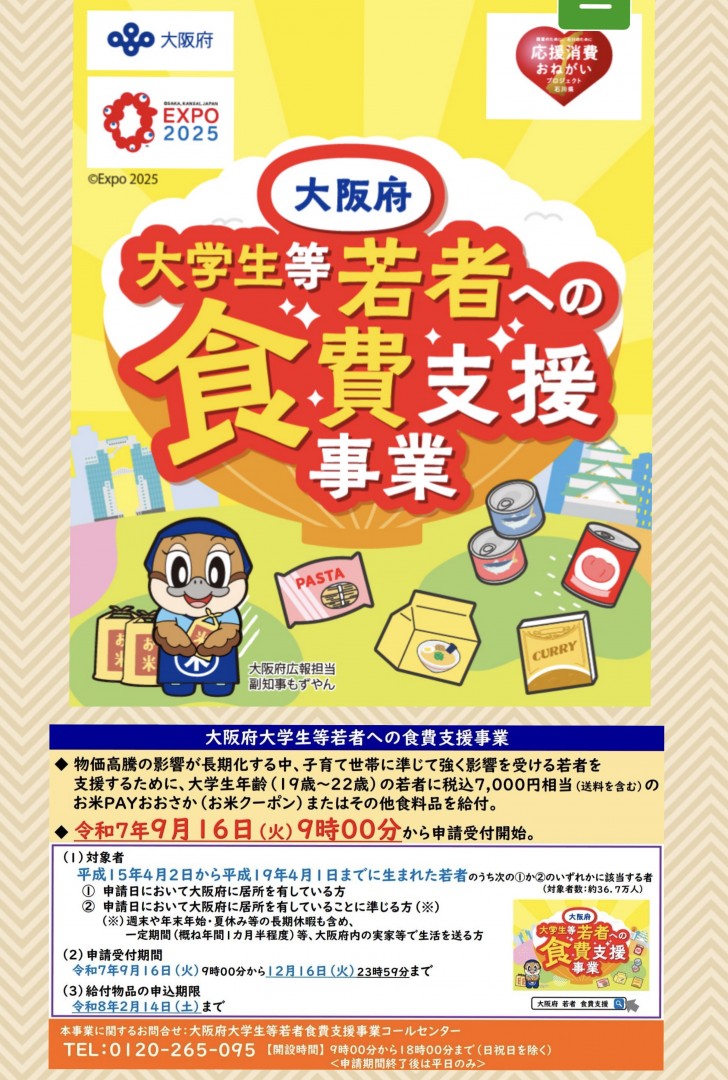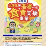 大阪府では「府大学生等若者への食費支援事業」により、大学生や19〜22歳の若者に¥7,000相当の米または食料品を無料で配ります。