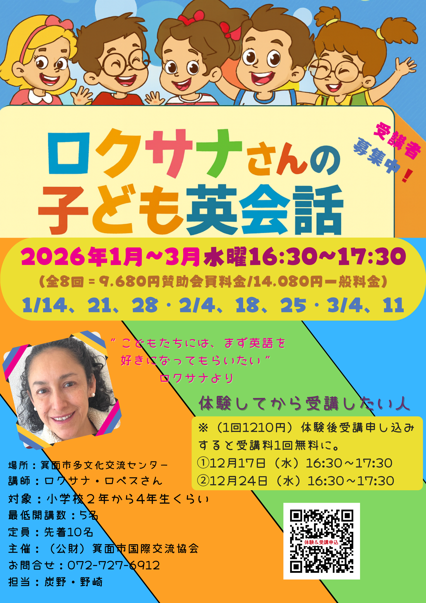 「록산나의 어린이 영어회화」는「즐겁게 배운다」를 모토로 어린이 영어에 대한 흥미를 이끌어 내는 클래스입니다. 2026년 1월부터 3월에 열립니다. 이번 겨울 영어회화를 시작해 보는 건 어떨까요?