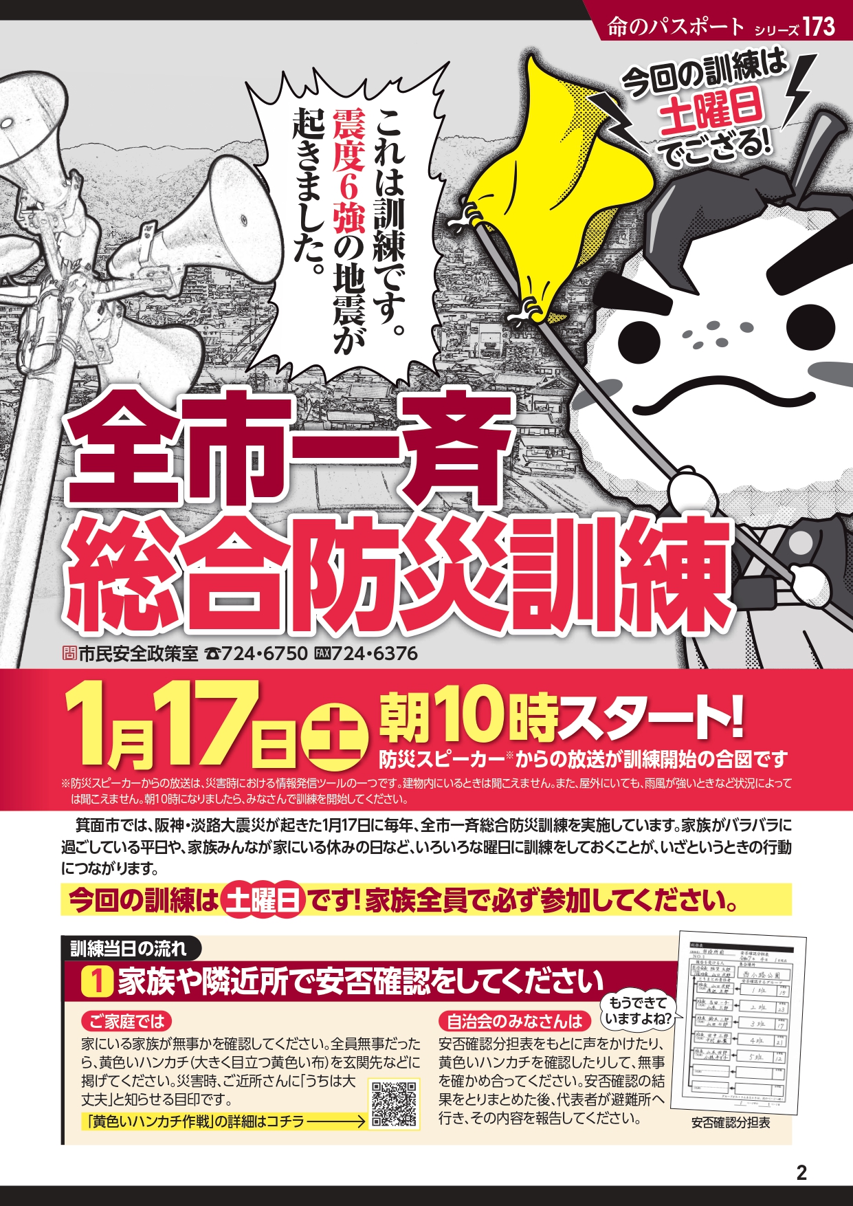 防灾演练旨在模拟发生大地震或其他灾害时,人们应采取的必要行动,提前进行练习。箕面市每年都会在1月17日举办由市民参与的防灾演练。本次防灾演练日为2026年1月17日(周六),请全家共同参加。当天上午 10:00,箕面市将通过您家附近公园等处设置的 “防灾广播喇叭”(“防災スピーカー”) 播放演练开始的通知。